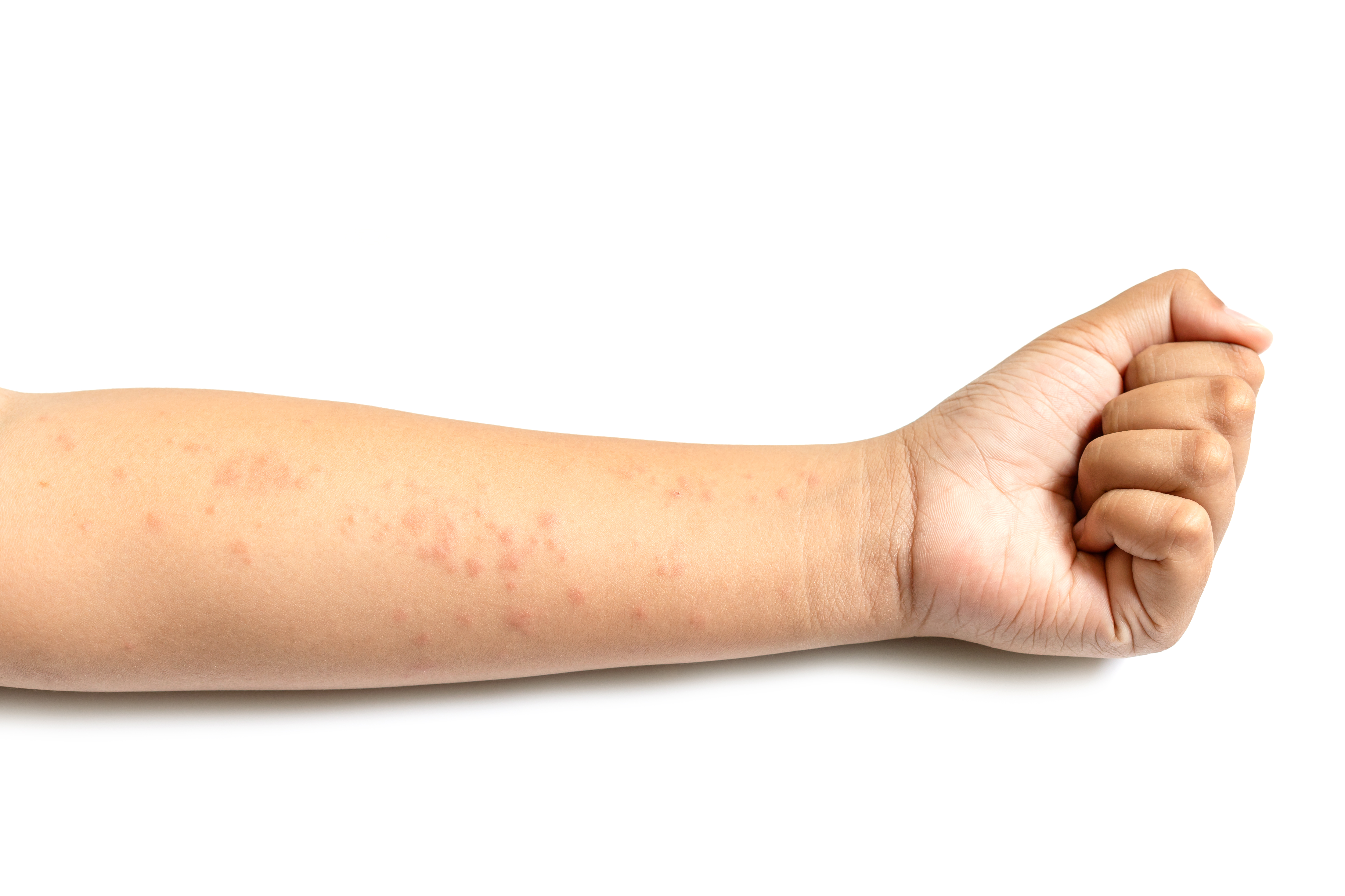 - 팔꿈치, 사타구니, 겨드랑이 등 주름부위가 더 진한 발진