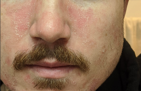 - 다양한 색상의 발진과 갈색 또는 검은색 피부에는 회색조가 있는 보라색 음염이며 흰색피부에는 은색 비늘이 있는 분홍색 또는 붉은색의 발진.
