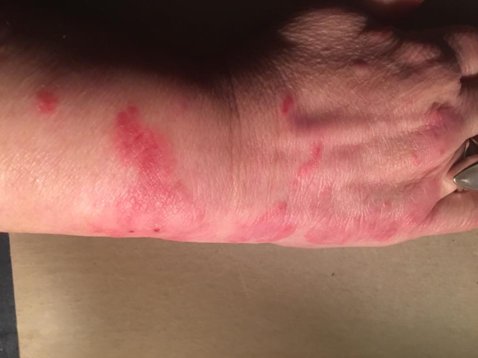 - 다양한 색상의 발진과 갈색 또는 검은색 피부에는 회색조가 있는 보라색 음염이며 흰색피부에는 은색 비늘이 있는 분홍색 또는 붉은색의 발진.